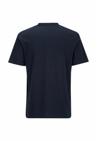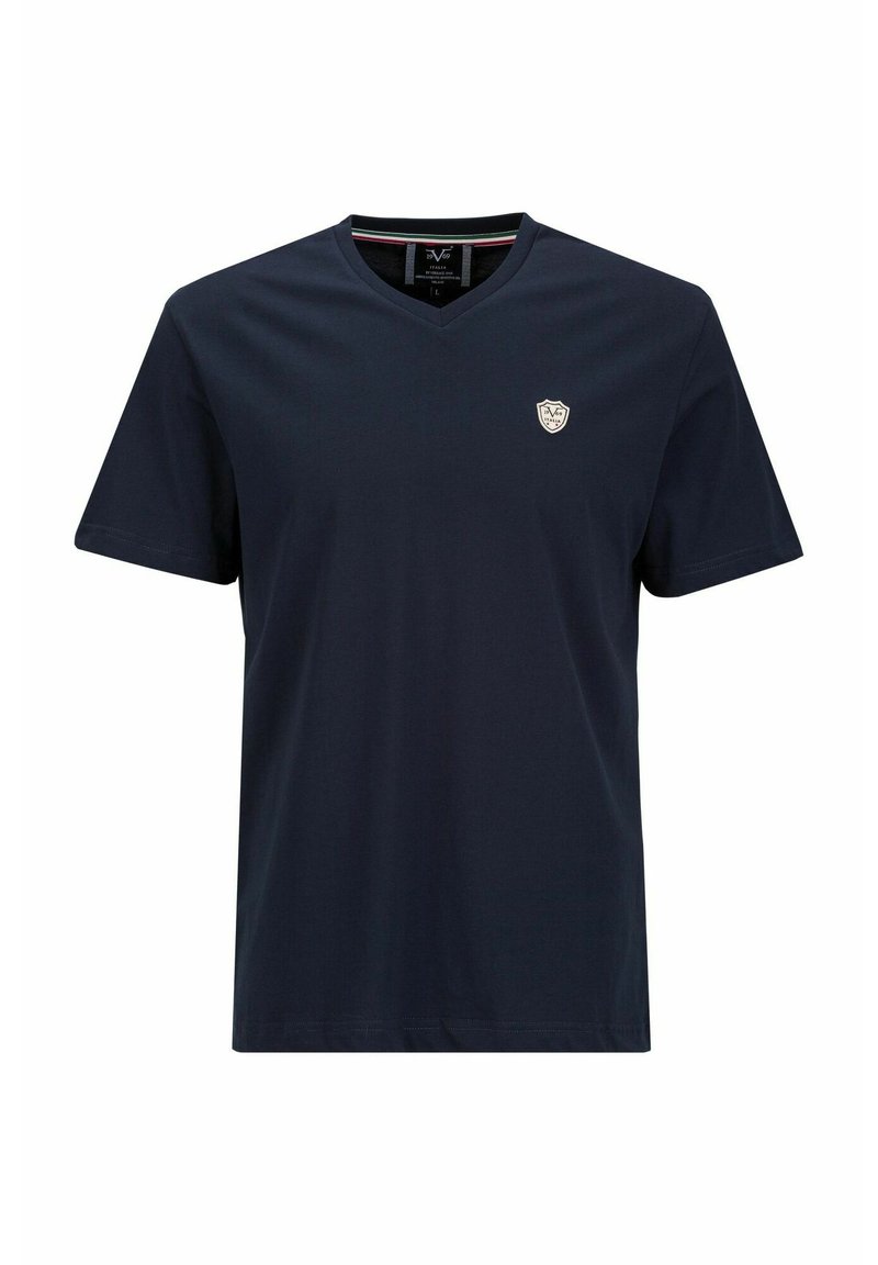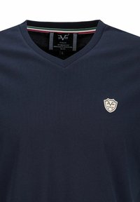 Marineblaues, kurzärmliges T-Shirt mit V-Ausschnitt. Verfügt über ein kleines, hell gefärbtes Logo auf der Brust und hat eine glatte, weiche Textur.