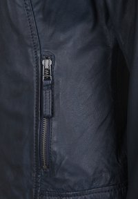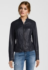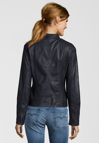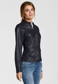 Schwarze Lederjacke mit Stehkragen, Reißverschluss vorne und gepolsterten Schulterakzenten. Verfügt über zwei seitliche Reißverschlusstaschen und eine taillierte Passform.