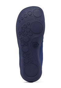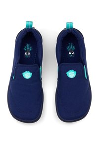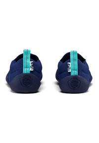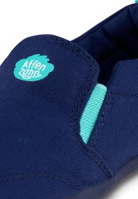 Marineblaue Slipper mit einem glatten Textiloberteil, kontrastierenden Türkistönen und einer flexiblen Gummisohle mit minimalem Profil.
