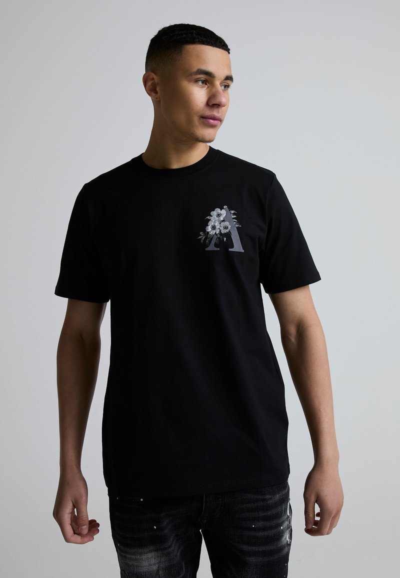 Junger Mann trägt ein schwarzes T-Shirt mit floraler Buchstabe "A"-Design, steht vor einem einfarbigen hellgrauen Hintergrund und blickt nach rechts.