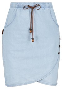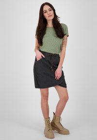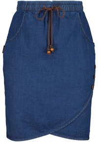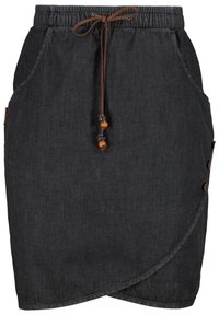 Dunkelgrauter Denim-Rock mit elastischem Taillenbund und Kordelzug, mit seitlichen Taschen und Knopfakzenten. Der Stoff hat eine glatte Textur.