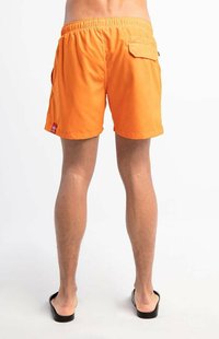 Orange Schwimmshorts mit einem elastischen Bund und Kordelzug, ausgestattet mit zwei Seitentaschen. Schwarze Slipper mit weißen Streifen.