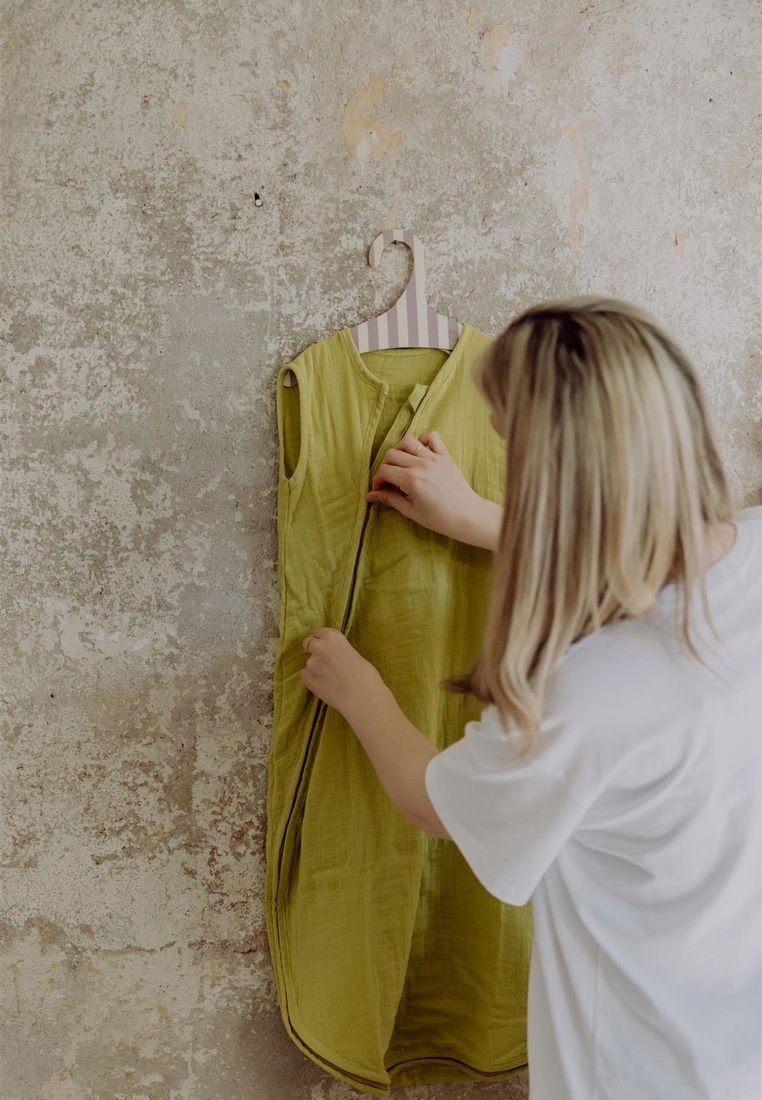 Linden grünes Kleid mit rundem Ausschnitt, kurzen Ärmeln und einem Reißverschluss auf der Vorderseite, das an einem gestreiften Kleiderbügel vor einer strukturierten Wand hängt.