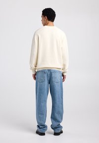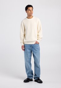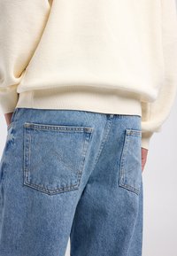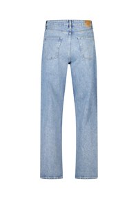 Hellblaue Jeans aus Denim mit lockerem Schnitt, fünf Taschen und leicht verblasster Textur. Kombiniert mit schwarzen Schuhen.