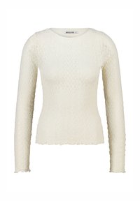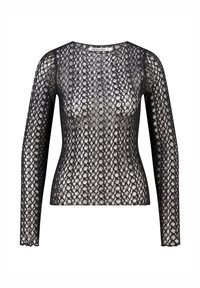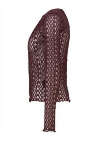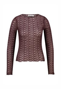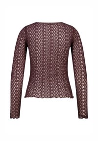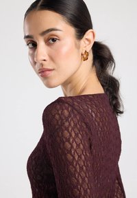 Bordeauxrotes Spitzenoberteil mit langen Ärmeln, versehen mit einem strukturierten Muster, rundem Ausschnitt und transparentem Detail. Kombiniert mit einem braunen Akzent-Ohrring.