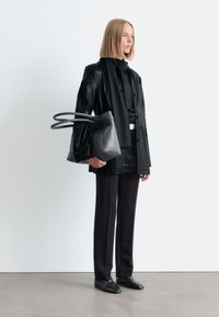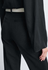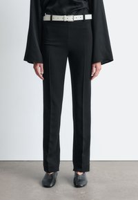 Schwarze, maßgeschneiderte Hosen mit geradem Schnitt, aus einem glatten Stoff gefertigt. Akzentuiert durch einen weißen Gürtel und kombiniert mit schwarzen spitzen Schuhen.