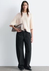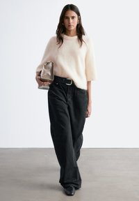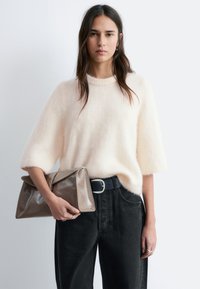 Frau mit langen dunklen Haaren trägt einen weißen, flauschigen Pullover, schwarze Hosen mit Gürtel und hält eine große taupefarbene Clutch vor einem schlichten hellen Hintergrund.