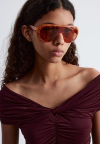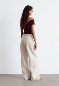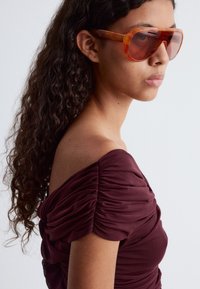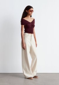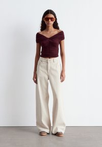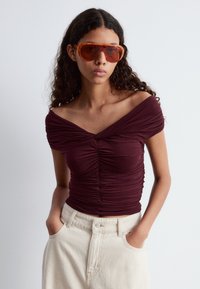 Bordeauxfarbene Off-Shoulder-Bluse mit Rüschen, figurbetontem Schnitt und Schlüsselloch-Ausschnitt; kombiniert mit hoch sitzenden beigen Jeans und übergroßen orangen Sonnenbrillen.