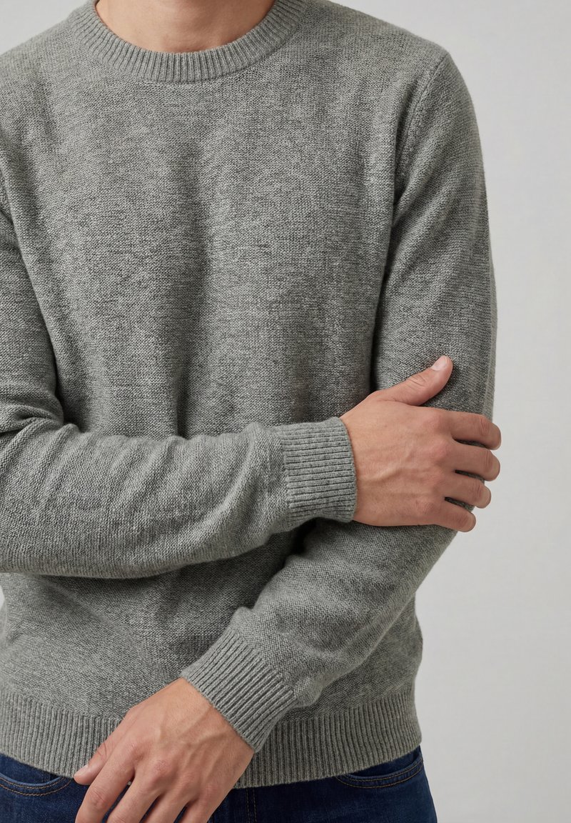 Mann trägt einen enganliegenden grauen Strickpullover mit gerippten Bündchen und Saum, hält den linken Oberarm mit der rechten Hand vor einfarbigem Hintergrund.