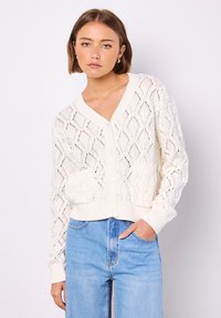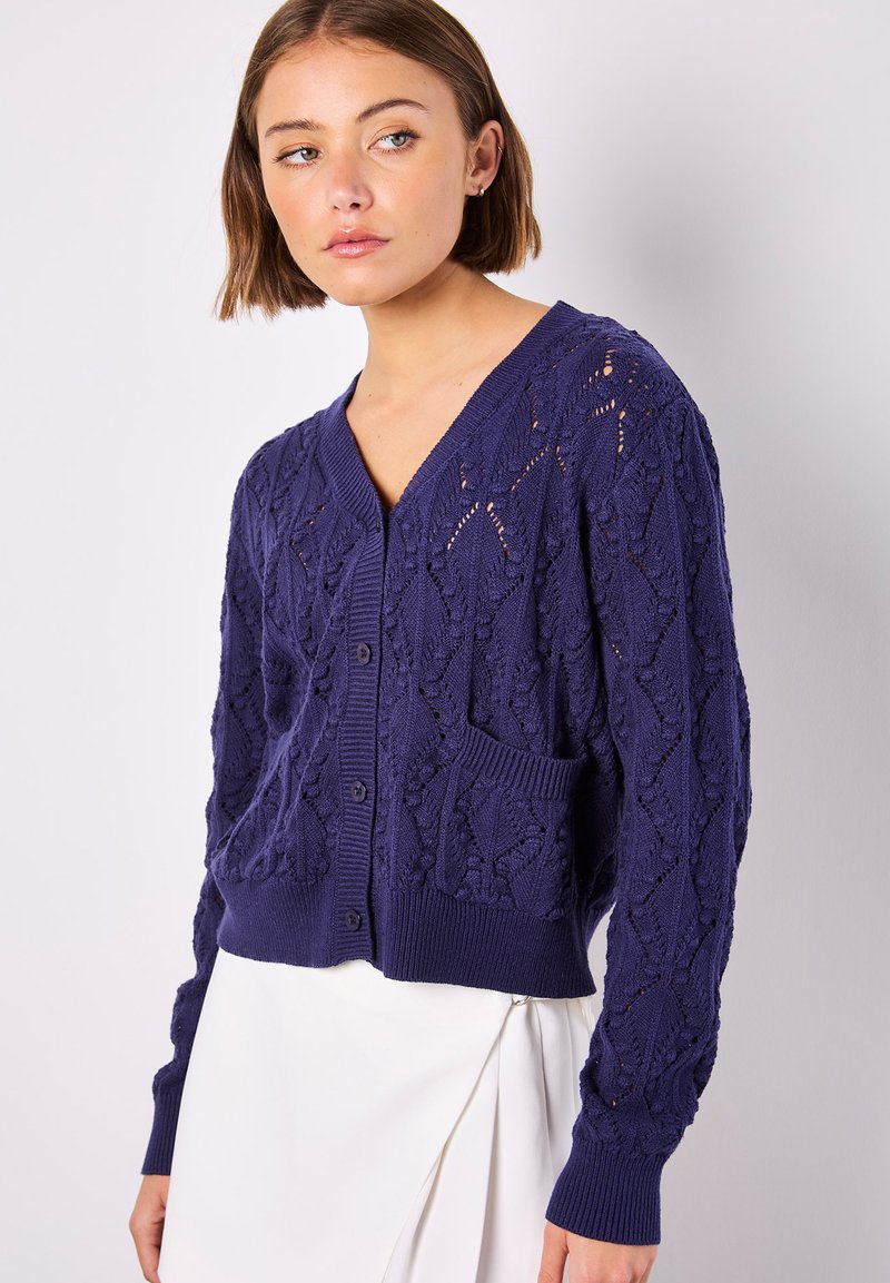 In einem mittelschweren Strick, besticht dieser Cardigan mit einem hübschen Lochmuster- und Popcornstrick. Er hat einen V-Ausschnitt, eine Knopfleiste vorne und zwei aufgesetzte Taschen am Saum.