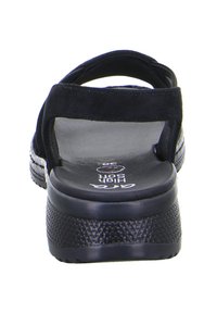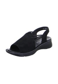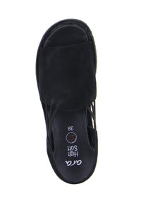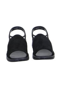 Schwarze Wildledersandale mit einem breiten Vorderriemen und offenem Fersenbereich. Texturiertes Fußbett mit leichter Erhöhung, das ein minimalistisches Design und schmale Akzente präsentiert.