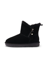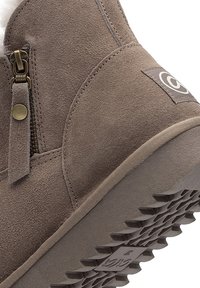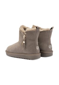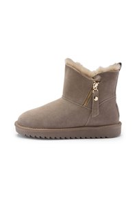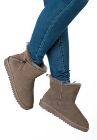 Person trägt braune Wildleder-Winterstiefel bis zur Mitte der Wade mit Fellfutter und seitlichem Reißverschluss, kombiniert mit blauen Skinny-Jeans vor weißem Hintergrund.