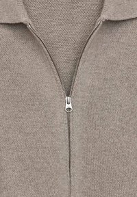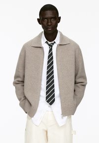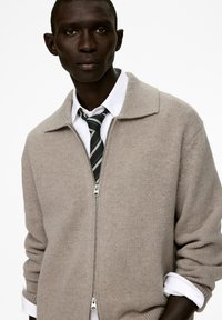 Beiger Strickcardigan mit Reißverschluss, breitem Kragen und gerippten Bündchen, über einem weißen Hemd und einer schwarz gestreiften Krawatte getragen.