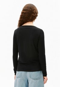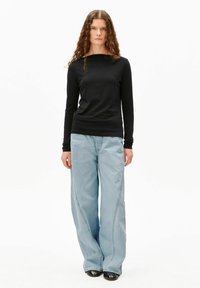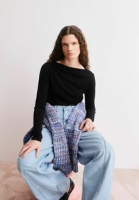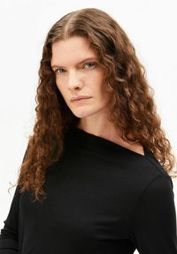Frau mit lockigem braunem Haar, die ein schwarzes Langarmshirt und hellblaue Jeans trägt und vor einem weißen Hintergrund steht.