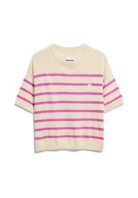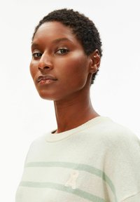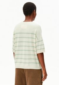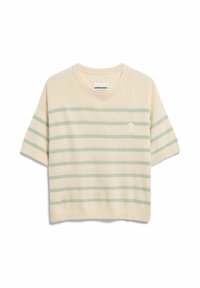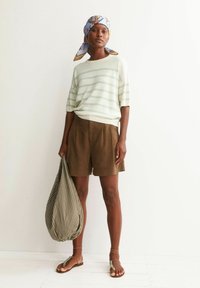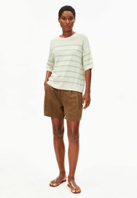 Person trägt einen hellgrün-weiß gestreiften Kurzarmpullover mit einem kleinen Aufnäher auf der Brust und braune Shorts, steht vor einem weißen Hintergrund.