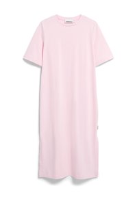 Hellgrünes, knielanges Kleid mit kurzen Ärmeln, seitlichen Schlitzen und einem minimalistischen Design. Kombiniert mit schwarzen Sandalen mit farbigen Akzenten.