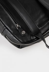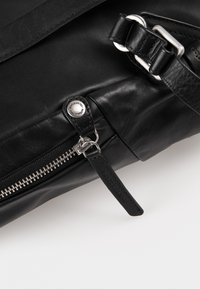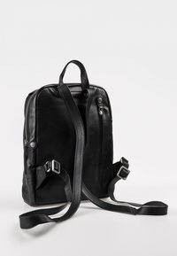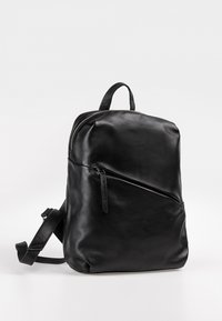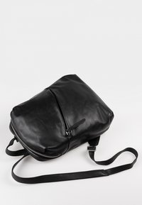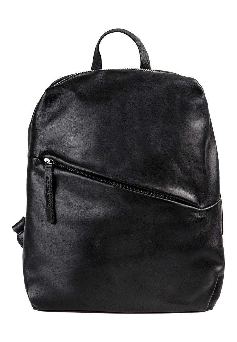 Schwarzer Leder-Rucksack mit glatter Textur, geschwungenem Design und diagonaler Reißverschlusstasche. Verfügt über einen oberen Griff und verstellbare Träger.