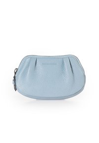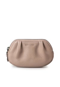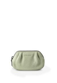 Olivgrünes Lederetui mit einer genarbten Textur, runder Form, gerafftem Detail und einem kontrastierenden Reißverschluss zum Verschließen.