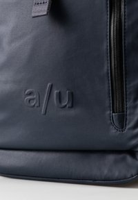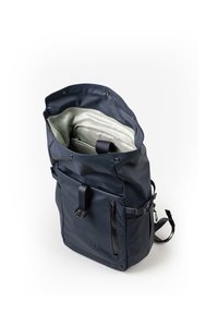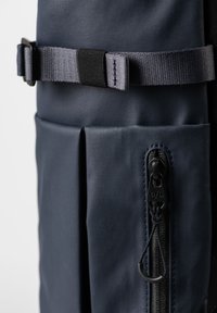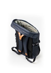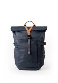 Dunkelblauer Rolltop-Rucksack mit beige-braunem Ledergriff, Front-Reißverschlusstasche und schwarzem Riemenverschluss auf weißem Hintergrund.