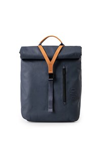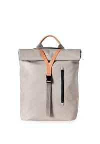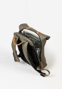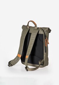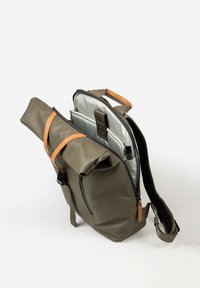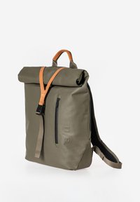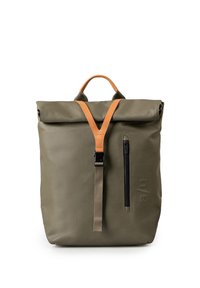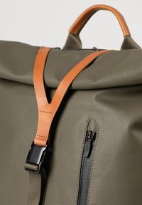 Olivgrüner Rolltop-Rucksack mit beigem Lederband, oberem Griff, vorderer vertikaler Reißverschlusstasche und schwarzem Schnappverschluss auf weißem Hintergrund.