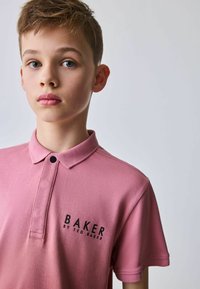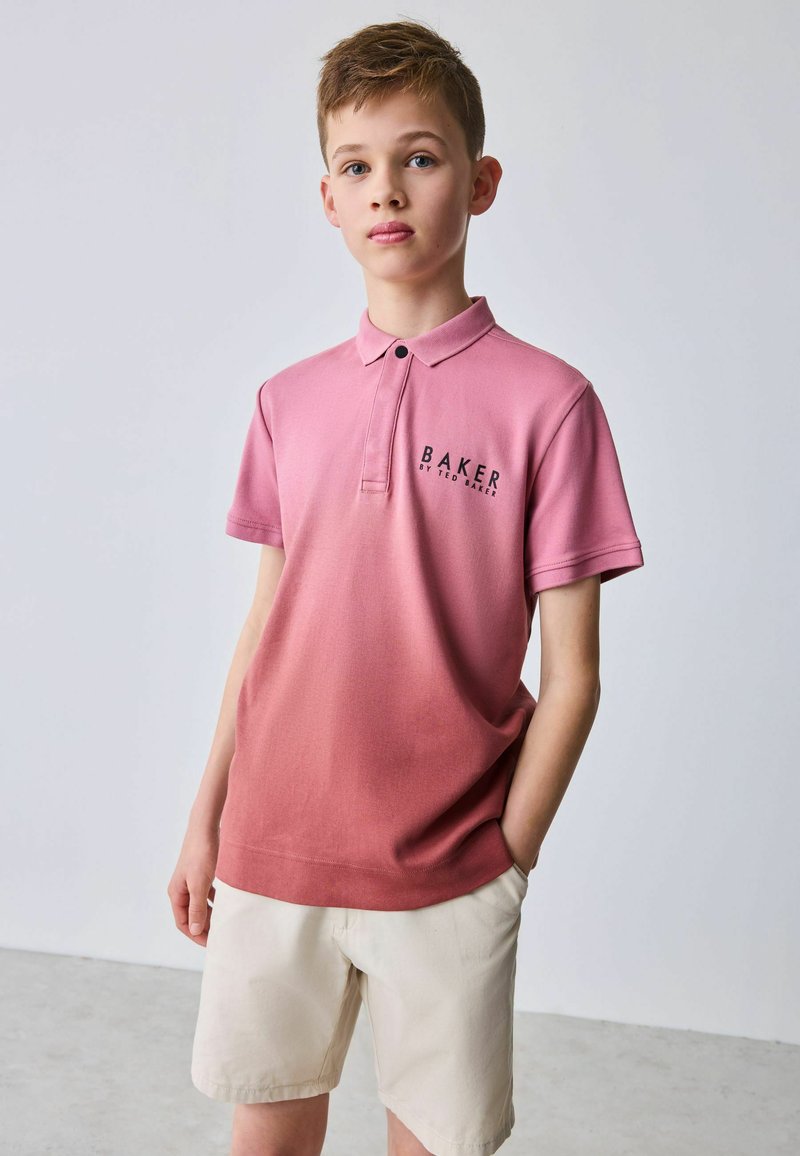 Junge trägt ein pinkes Poloshirt mit dem Logo „Baker by Ted Baker“ und beige Shorts, steht mit einer Hand in der Tasche vor einem einfarbigen Hintergrund.