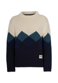 Strickpullover mit einem cremefarbenen Oberteil, geometrischem Rautenmuster in den Farbtönen Teal, Grau und Dunkelgrün, mit Rundhalsausschnitt und gerippten Bündchen.