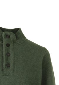 Grüner Pullover mit hohem Kragen, fünf schwarzen Knöpfen und Rippstrickakzenten am Kragen und Saum. Weiches, strukturiertes Strickmaterial.