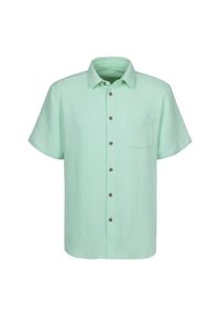 Kurzärmliges, dunkelgrünes Hemd mit Knöpfen aus strukturiertem Stoff. Verfügt über eine Brusttasche und aufgerollte Ärmel, ergänzt durch helle Knöpfe.