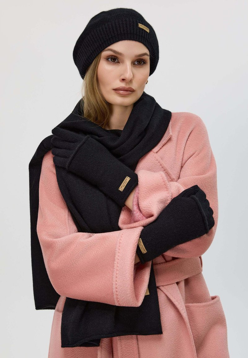 Schwarze Strickmütze, passende Schal und fingerlose Handschuhe, kombiniert mit einem weichen rosa Mantel. Verfügt über strukturierter Stoff und braune Akzente.