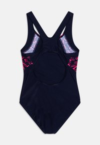 Marine-blauer Einteiler mit rosa geometrischen Akzenten. Verfügt über ein Racerback-Design und ein gesticktes Logo auf der Brust. Glatte Textur.