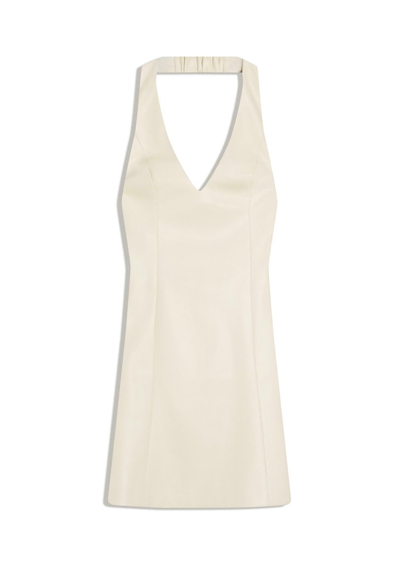 Ärmelloses, cremefarbenes Neckholder-Kleid mit tiefem V-Ausschnitt und figurbetontem Oberteil, das bis über das Knie reicht, vor weißem Hintergrund dargestellt.