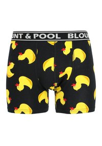 Fünf Paar Herren-Boxershorts mit bunten Mustern, darunter Flamingos, Tukanvögel, tropische Blumen, Quietscheentchen und ein schlichtes weißes Paar.