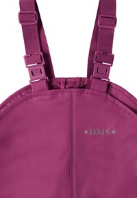 Lila wasserdichte Latzhose mit verstellbaren Trägern, reflektierenden Bändern an den Knöcheln und elastischen Bündchen für einen sicheren Sitz. Mit "BMS"-Logo.