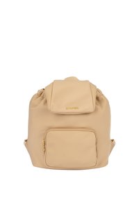 Beige Nylon-Rucksack mit Klappenverschluss, vorderer Reißverschlusstasche und goldenen Hardware-Details. Hat eine entspannte, weiche Form mit verstellbaren Tragriemen.