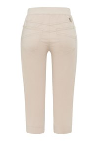 Beige Capri-Hosen mit taillierter Passform, ausgestattet mit einer glatten Textur, zwei vorderen Taschen und einem umgeschlagenen Saum oberhalb des Knöchels.