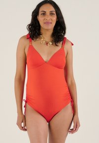 Schwarzes Schwangerschaftsbadeanzug mit gerippter Textur, verstellbaren Bindeträgern und seitlichen Raffungselementen. Mit dezenten goldenen Akzenten.