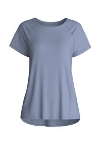 Helleblaue, kurzärmelige Sport-T-Shirts mit rundem Halsausschnitt, glatter Textur und Raglanärmeln. Schlichtes Design ohne Muster.