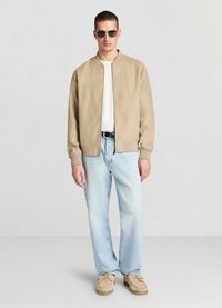 Beiger Bomberjacke aus glattem Stoff, mit durchgehendem Reißverschluss, gerippten Bündchen und schrägen Taschen an der Taille. Über einem weißen Hemd getragen.