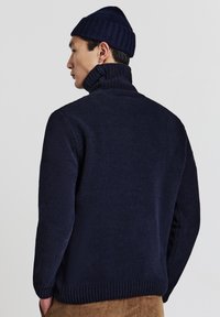 • Navy Blau gestrickter Pullover mit hohem Kragen und halbem Reißverschluss. Strukturiertes Material und gerippte Bündchen runden das Design ab.