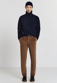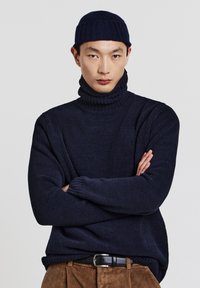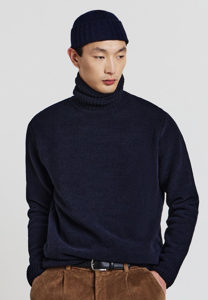 Mann in einem navyblauen Rollkragenpullover und einer Mütze, mit braunen Cordhosen und einem schwarzen Gürtel, die Hände in den Taschen, schaut zur Seite.