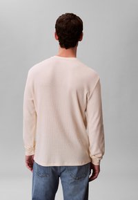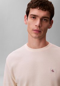 Junger Mann, der ein cremefarbenes, strukturiertes Langarmshirt mit "cK"-Logo auf der Brust und blaue Jeans trägt, steht mit den Händen in den Taschen vor einem grauen Hintergrund.