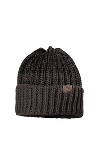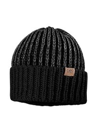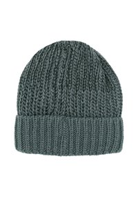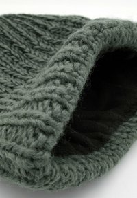 Dunkelgrüne, dicke, gerippte Strickmütze mit umgeschlagener Krempe und kleinem braunem Etikett mit der Aufschrift "CAPO STAY AHEAD" auf weißem Hintergrund.