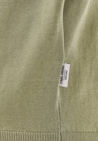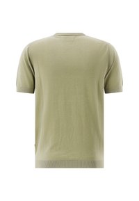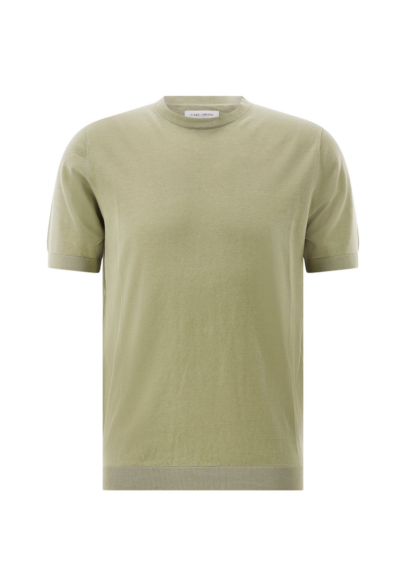 Kurzärmeliges, hellolivgrünes Rundhals-Pullover mit gerippten Bündchen und Saum, dargestellt vor einem schlichten weißen Hintergrund.