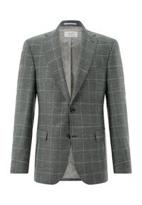 Herrenblazer in Blau mit Karomuster, zwei Knöpfen, abgestepptem Revers, Pattentaschen und gemustertem Innenfutter, vorne gezeigt.