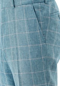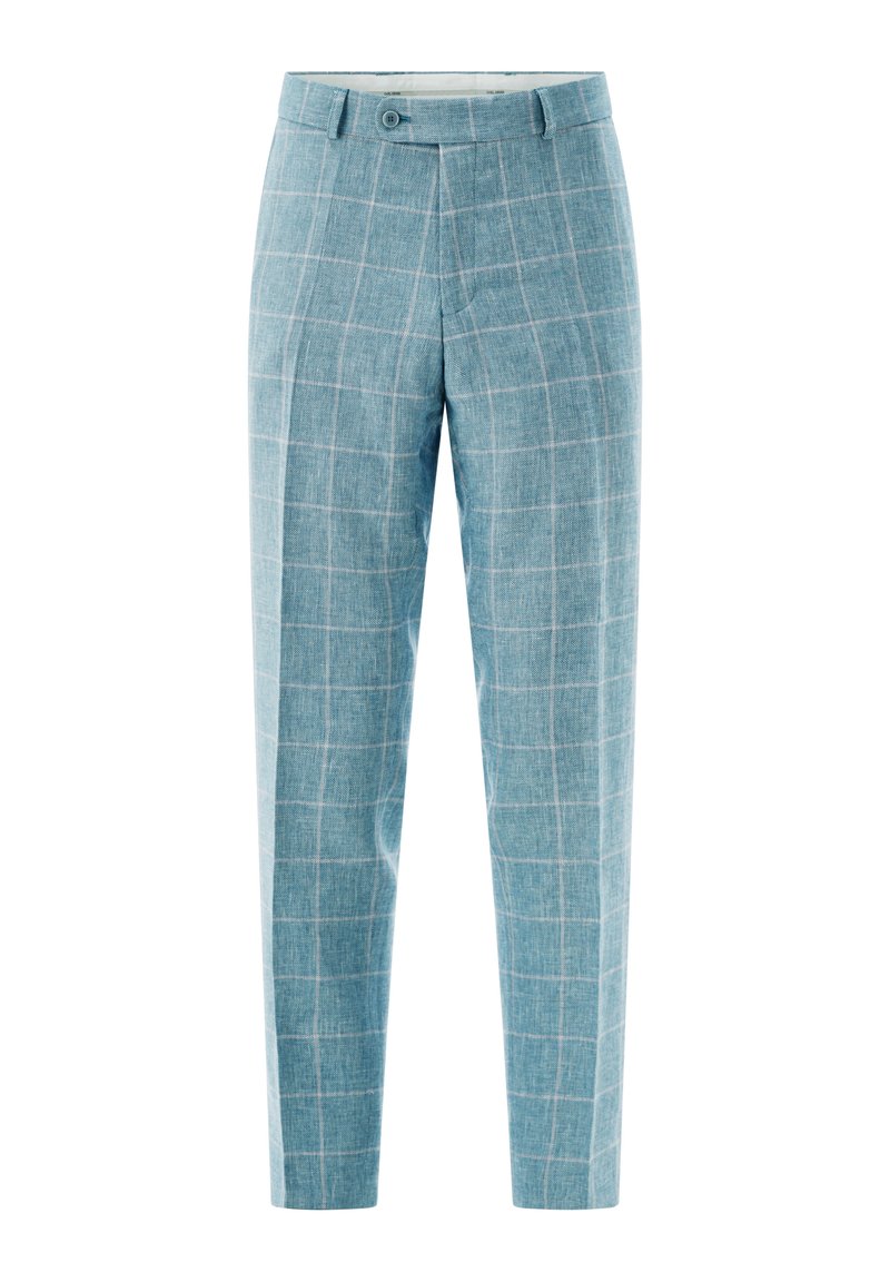 Hellblaue, maßgeschneiderte Hose mit weißem Karomuster, Knopfverschluss und Gürtelschlaufen.