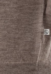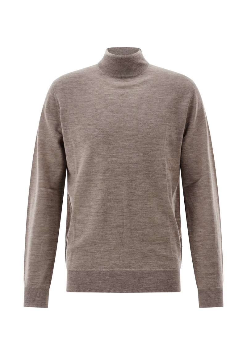 Hellbraunes langärmliges Rollkragenpullover mit geripptem Kragen, Bündchen und Saum, vor weißem Hintergrund präsentiert.