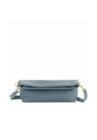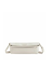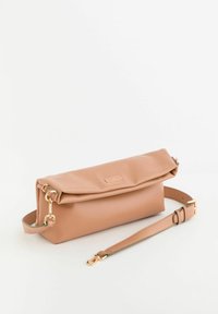 Hellbraune Leder-Clutch mit klappbarem Oberteil und abnehmbarem Schulterriemen mit goldfarbenen Verschlüssen auf weißem Hintergrund.