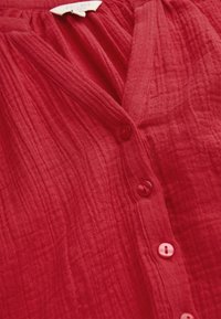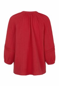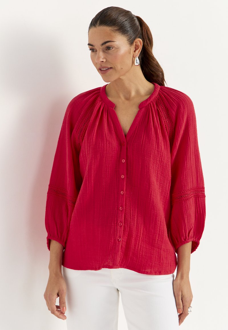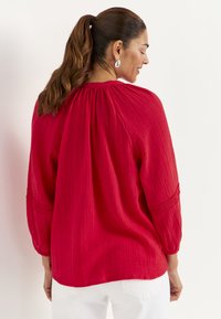 Frau mit zurückgebundenem Haar, die silberne Ohrringe trägt, eine rote Bluse mit Knöpfen und Puffärmeln sowie eine weiße Hose, blickt leicht nach rechts.