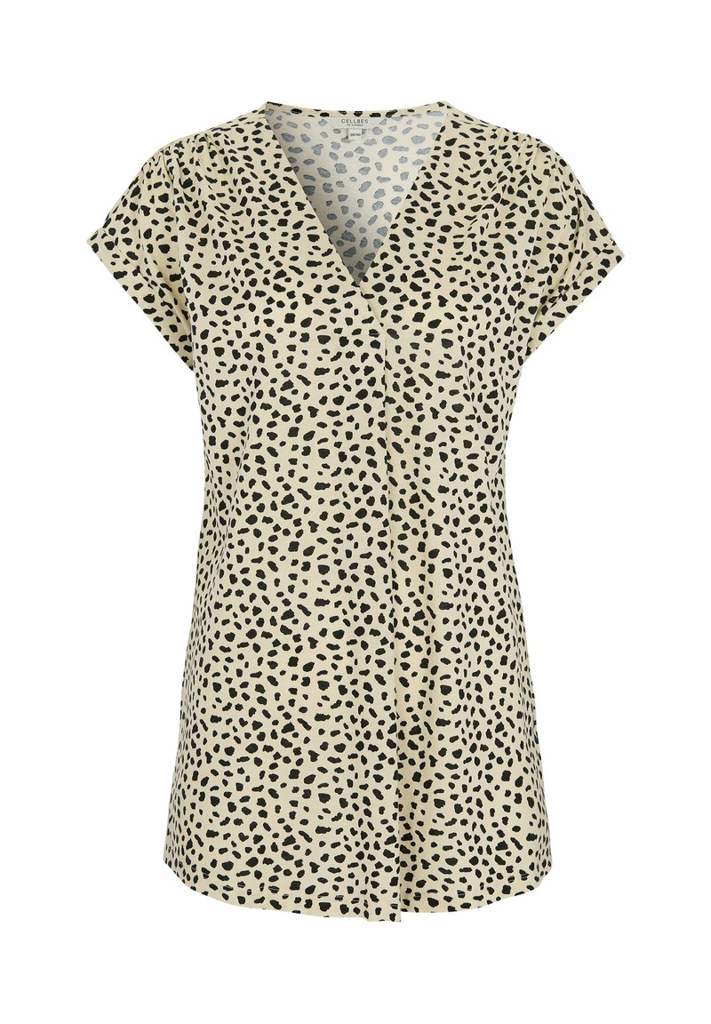 Beige V-Ausschnitt Bluse mit kurzen Ärmeln, schwarzem unregelmäßigem Punktmuster und lockerem Sitz.