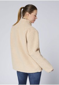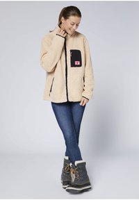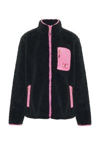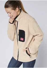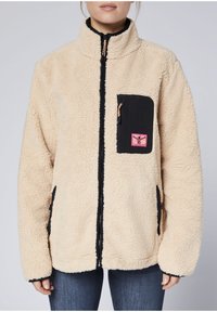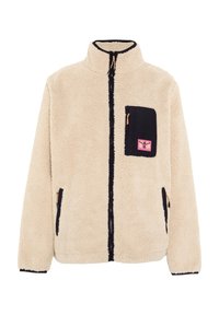 Fleecejacke in Beige mit schwarzen Akzenten, ausgestattet mit hohem Kragen, Reißverschluss und einer Brusttasche mit pinkem Logo-Patch.